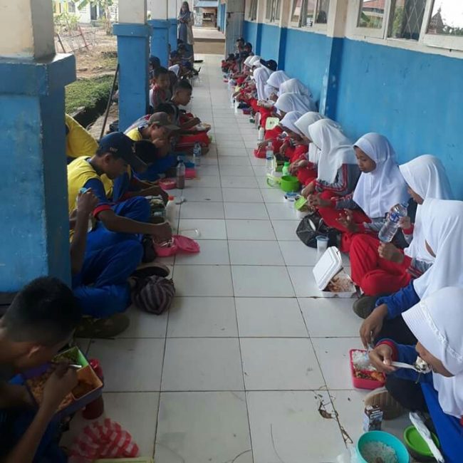 Guru, Kepala Sekolah dan Siswa mendeklarikaskan Sekolah Ramah Anak dengan mentandatangani spanduk Sekolah Ramah Anak yang di pajang di depan ruangan administrasi Sekolah
