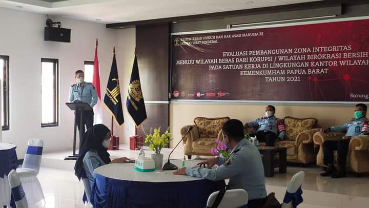 Sorong, Exposetimur.com – Kepala kantor Wilayah Kemenkumham Papua Barat Slamet Prihantara, Para Kepala Divisi bersama para Pejabat Administrator pengawas dan Tim Pokja Pembangunan Zona Integritas menuju WBK/WBBM Kanwil maupun pada jajaran Unit Pelaksana Teknis (UPT) yang diusulkan raih WBK/WBBM mengikuti kegiatan Entry Meeting Evaluasi Wilayah Bebas dari Korupsi dan Wilayah Birokrasi Bersih dan Melayani di Aula Kantor Imigrasi TPI Kelas II Sorong (19/04/2021) kemarin.
