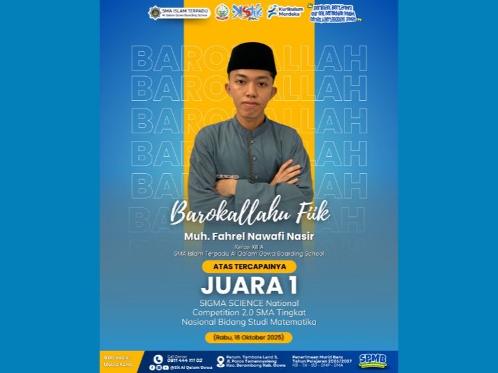 Gowa, – Kabar membanggakan datang dari dunia pendidikan Sulawesi Selatan. Muh. Fahrel Nawafi Nasir, siswa Kelas XII A SMA Islam Terpadu Al Qalam Gowa Boarding School, berhasil mengharumkan nama daerah dan sekolahnya dengan meraih Juara 1 Nasional dalam ajang SIGMA Science National Competition 2.0, bidang studi Matematika.