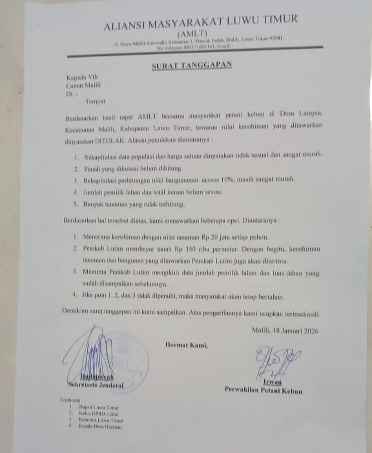 Surat tanggapan tersebut disampaikan kepada Pemerintah Kecamatan Malili dan ditandatangani atas nama Irwan sebagai perwakilan petani kebun serta Rudiansyah sebagai sekretaris jenderal, tertanggal 18 Januari 2026.